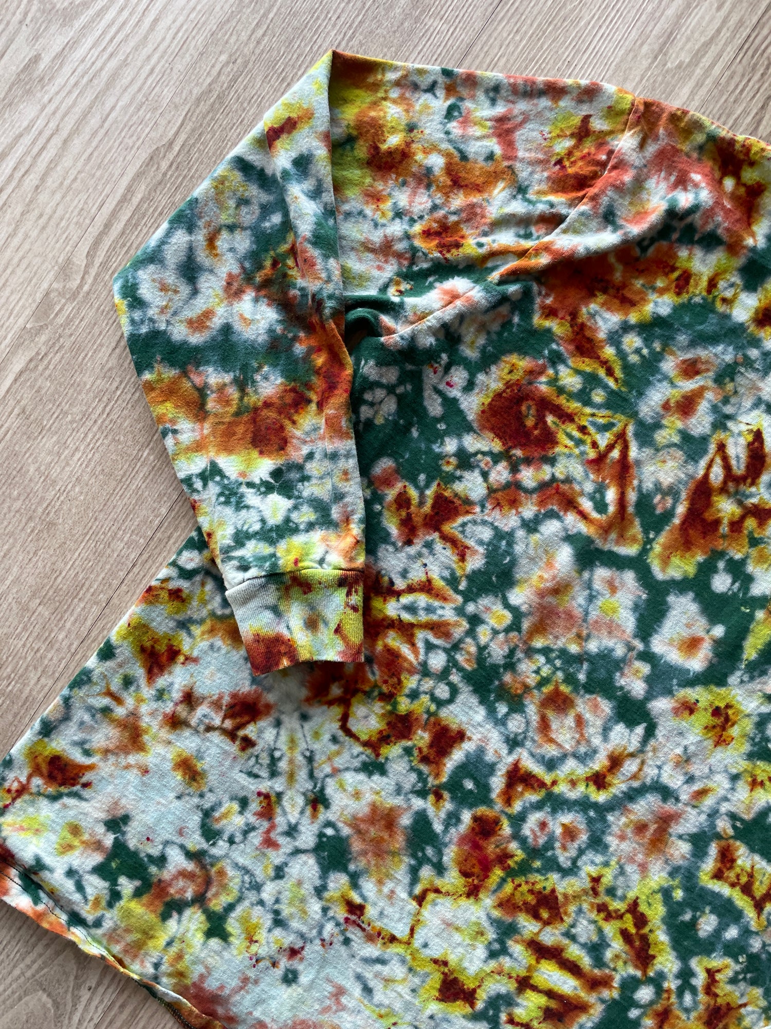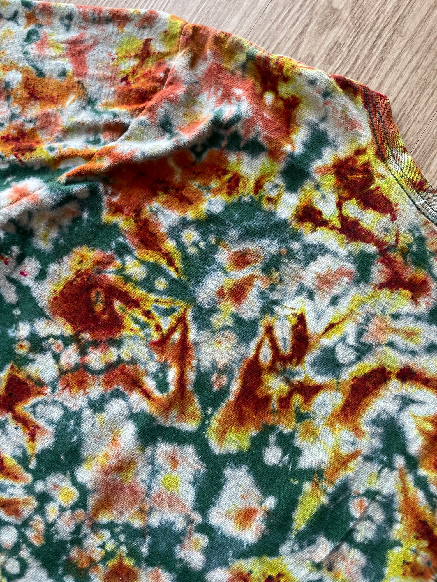 forest green tshirt bleached and dyed with shades of yellow and orange crumpled tie dye pattern