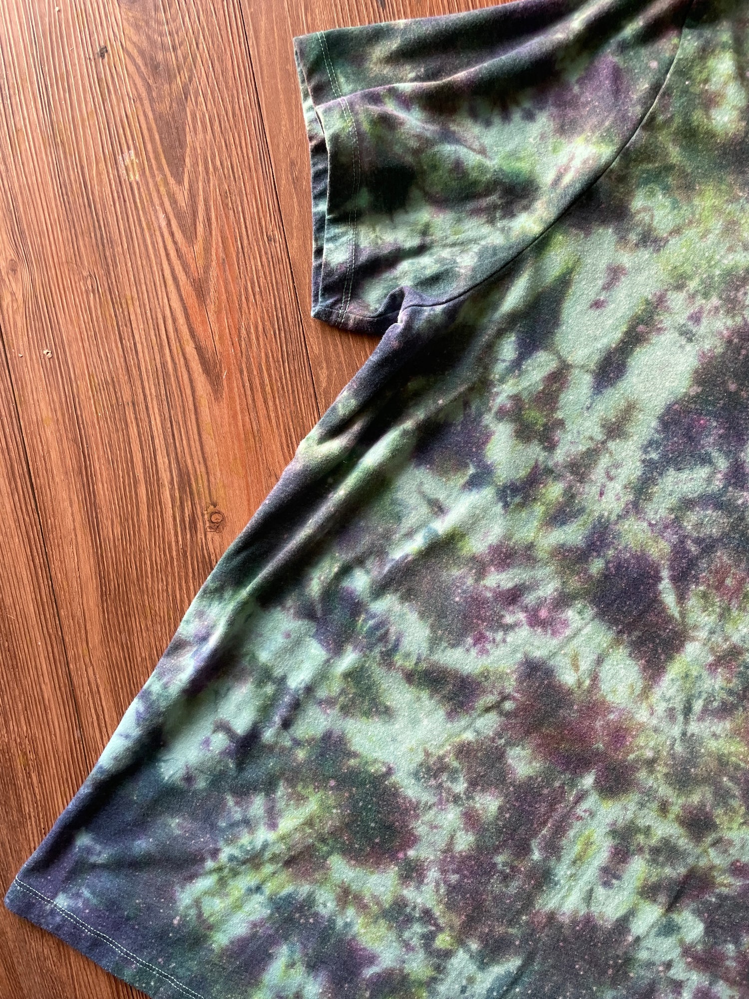 teal green tshirt dyed with blue and purple crumpled tie dye pattern