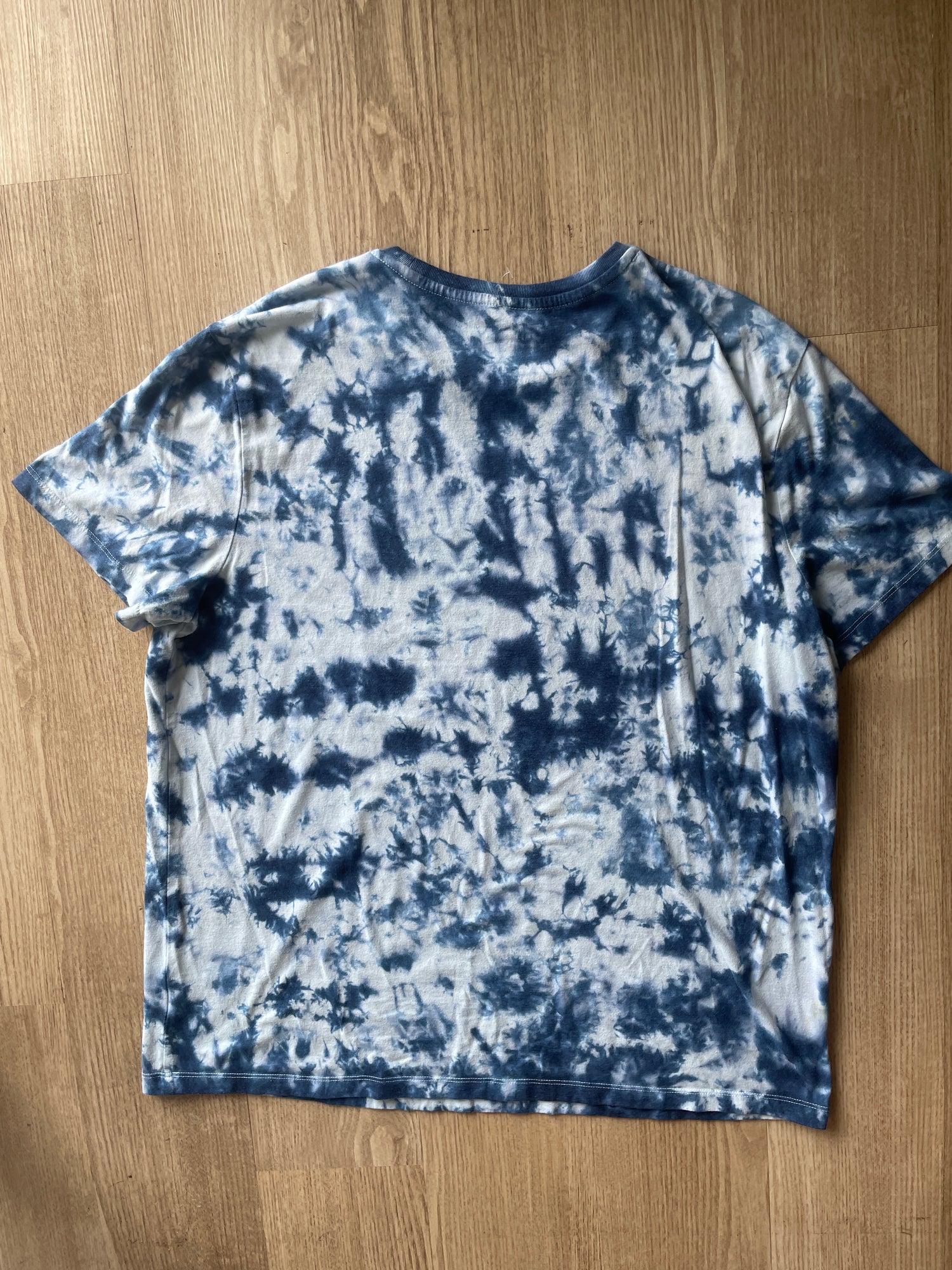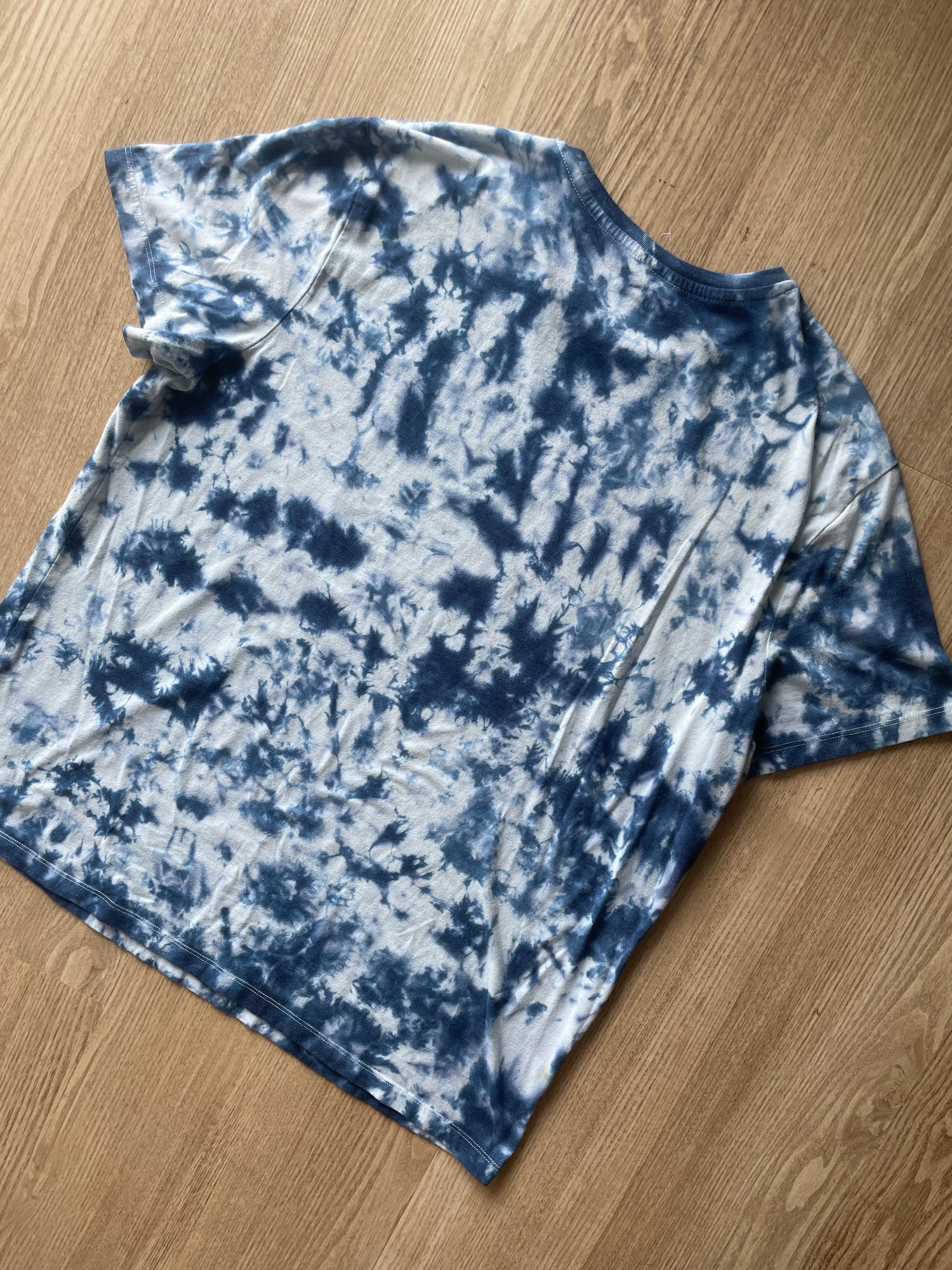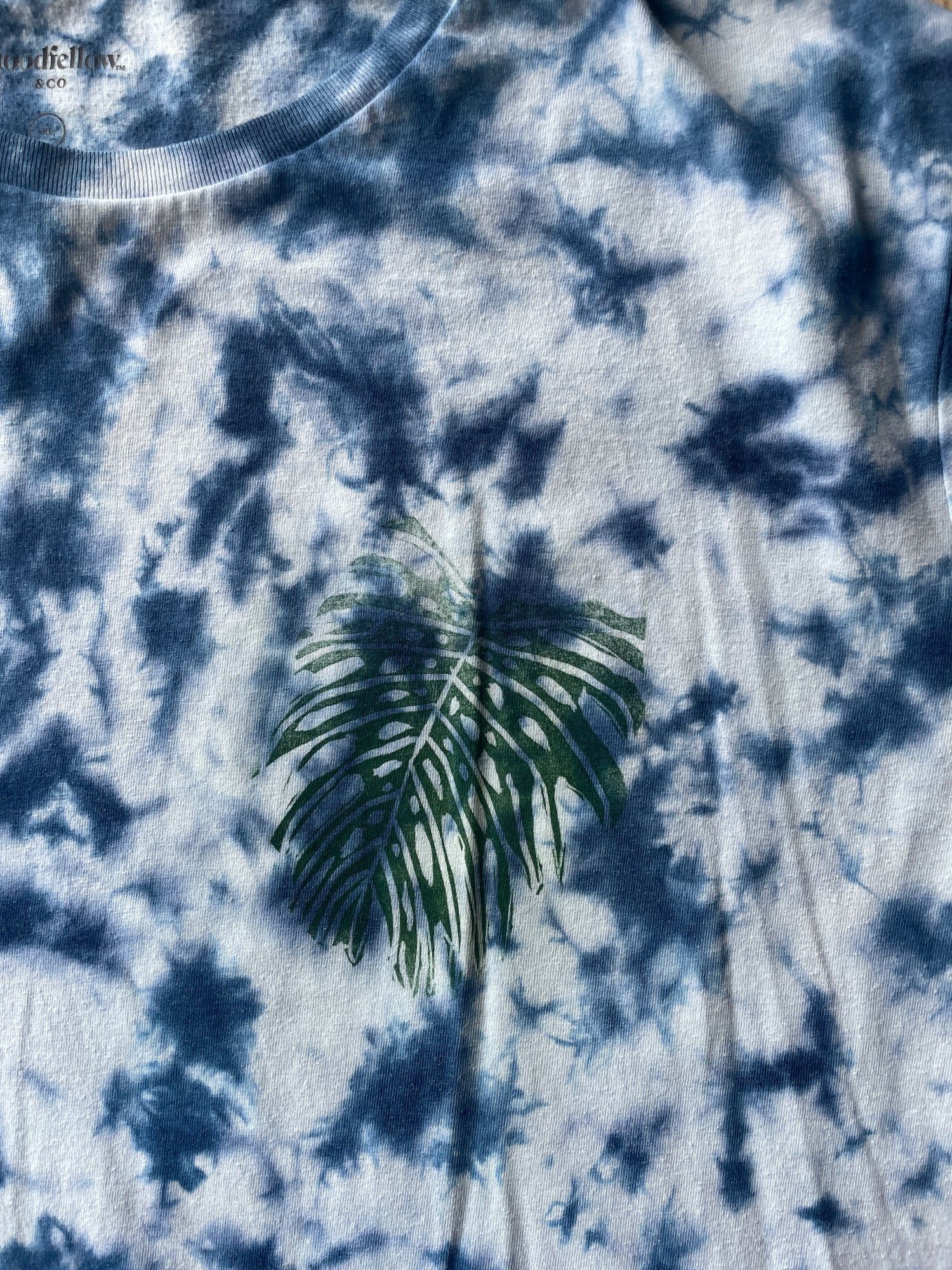 XL Men’s Monstera Leaf Tie Dye T-Shirt | One-Of-a-Kind Blue and White Crumpled Short Sleeve