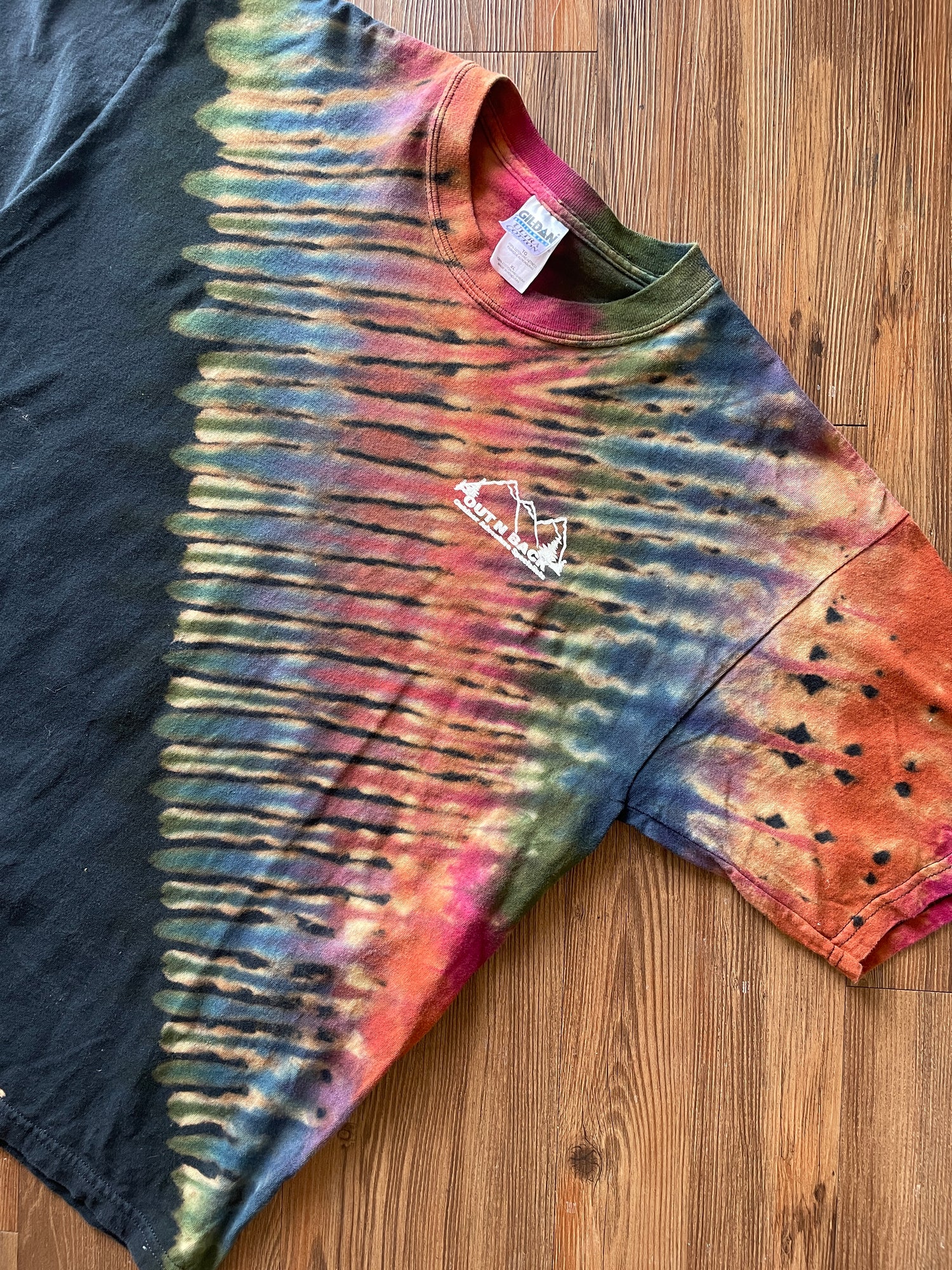 XL Men’s Out n Back Outdoor Adventure Specialists Handmade Tie Dye T-Shirt | Warm Tones Earth Tones Pleated Bleach Dye Short Sleeve