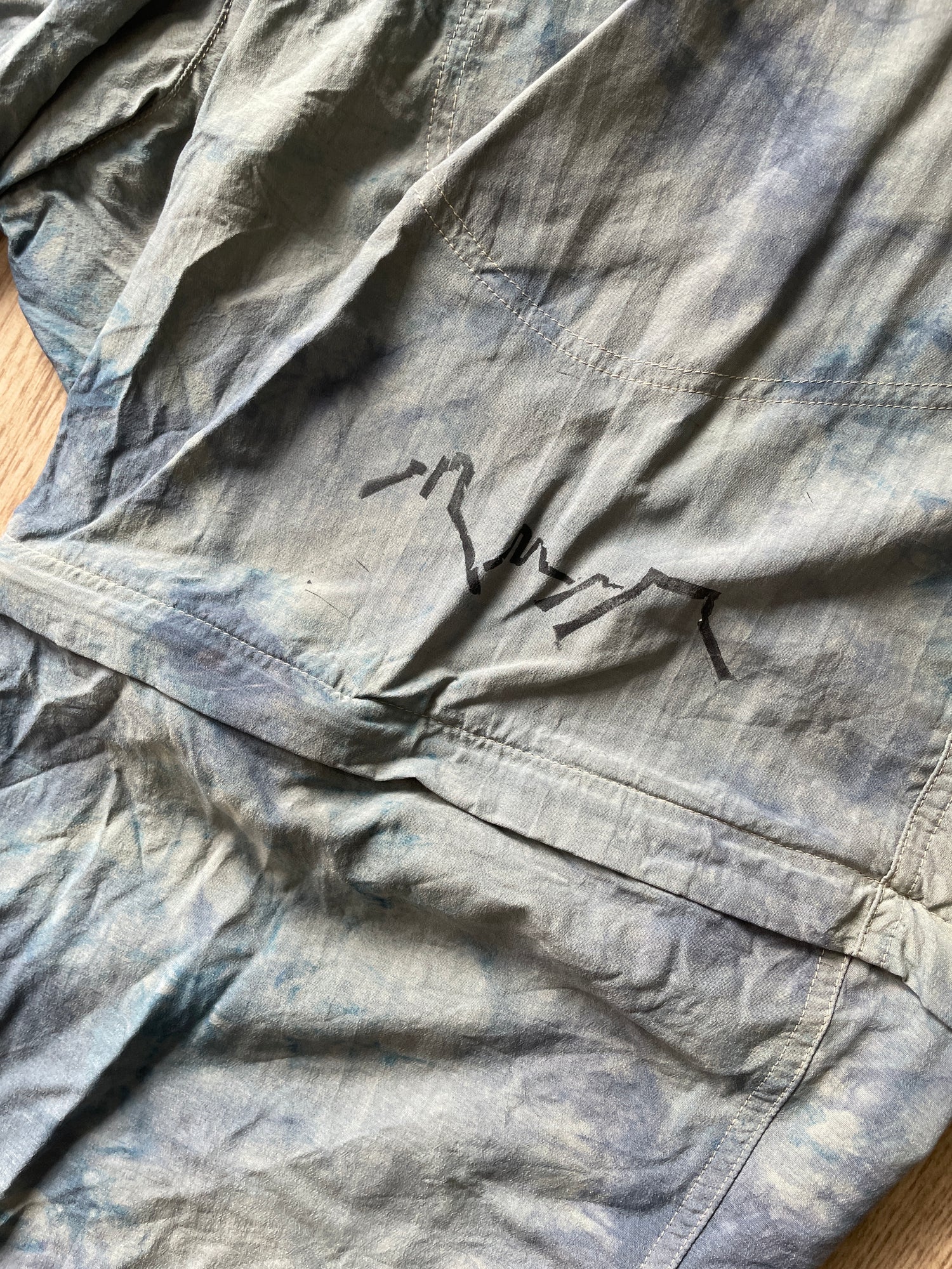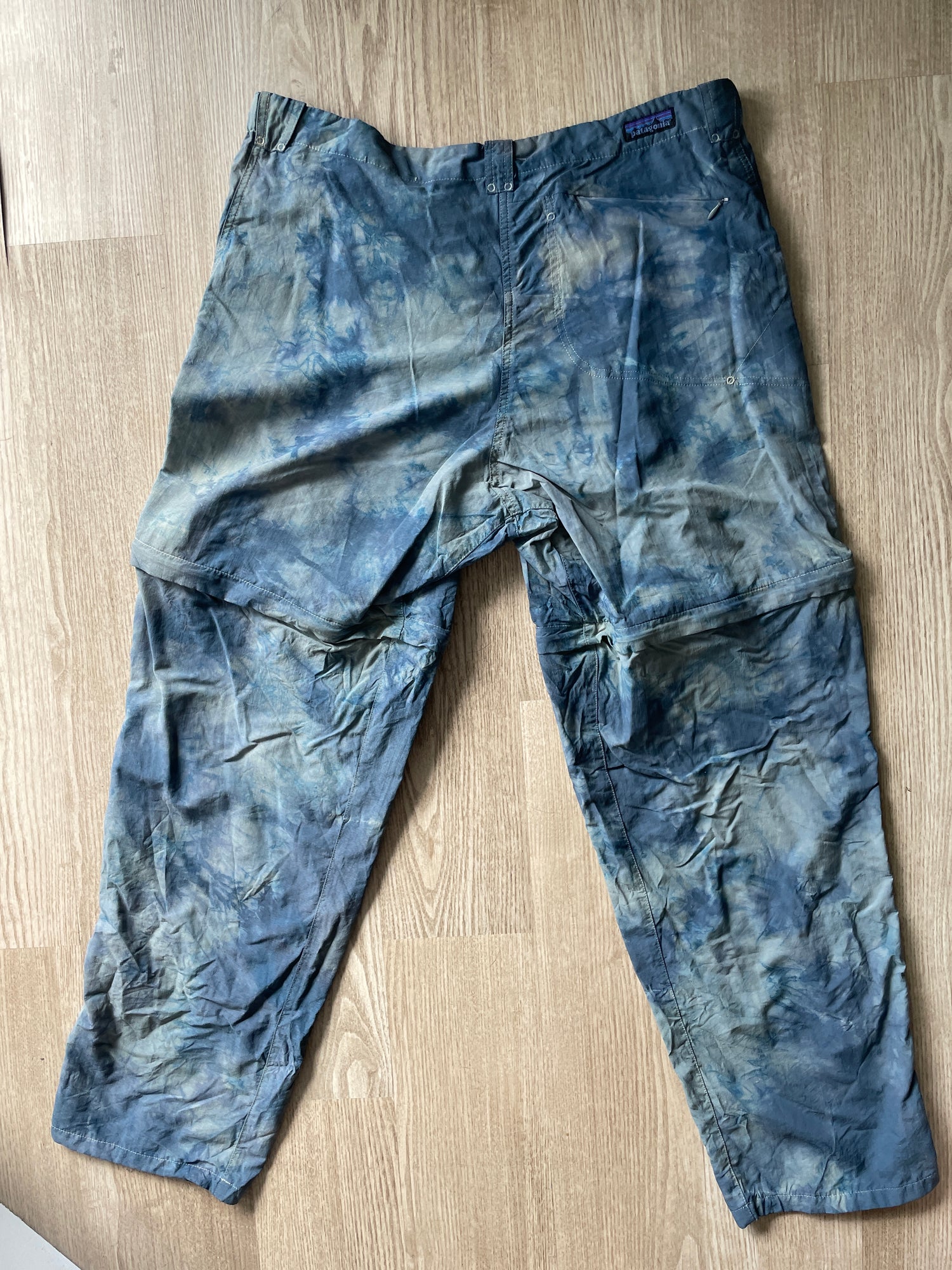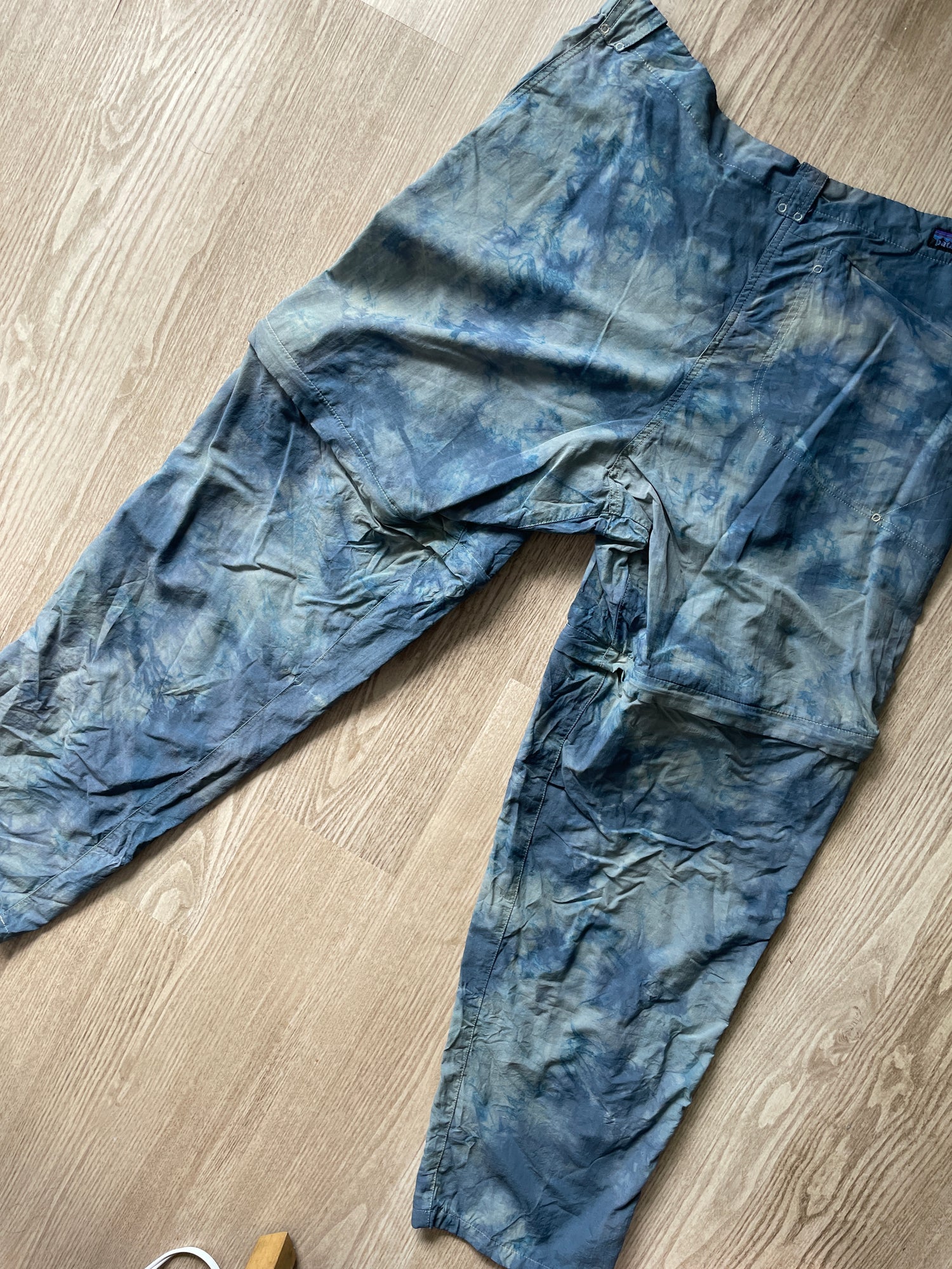 XL Men’s Patagonia Quandary Convertible Tie Dye Pants with Handprinted Graphics | One-Of-a-Kind Upcycled Blue and Gray Crumpled Pant/Short Combo