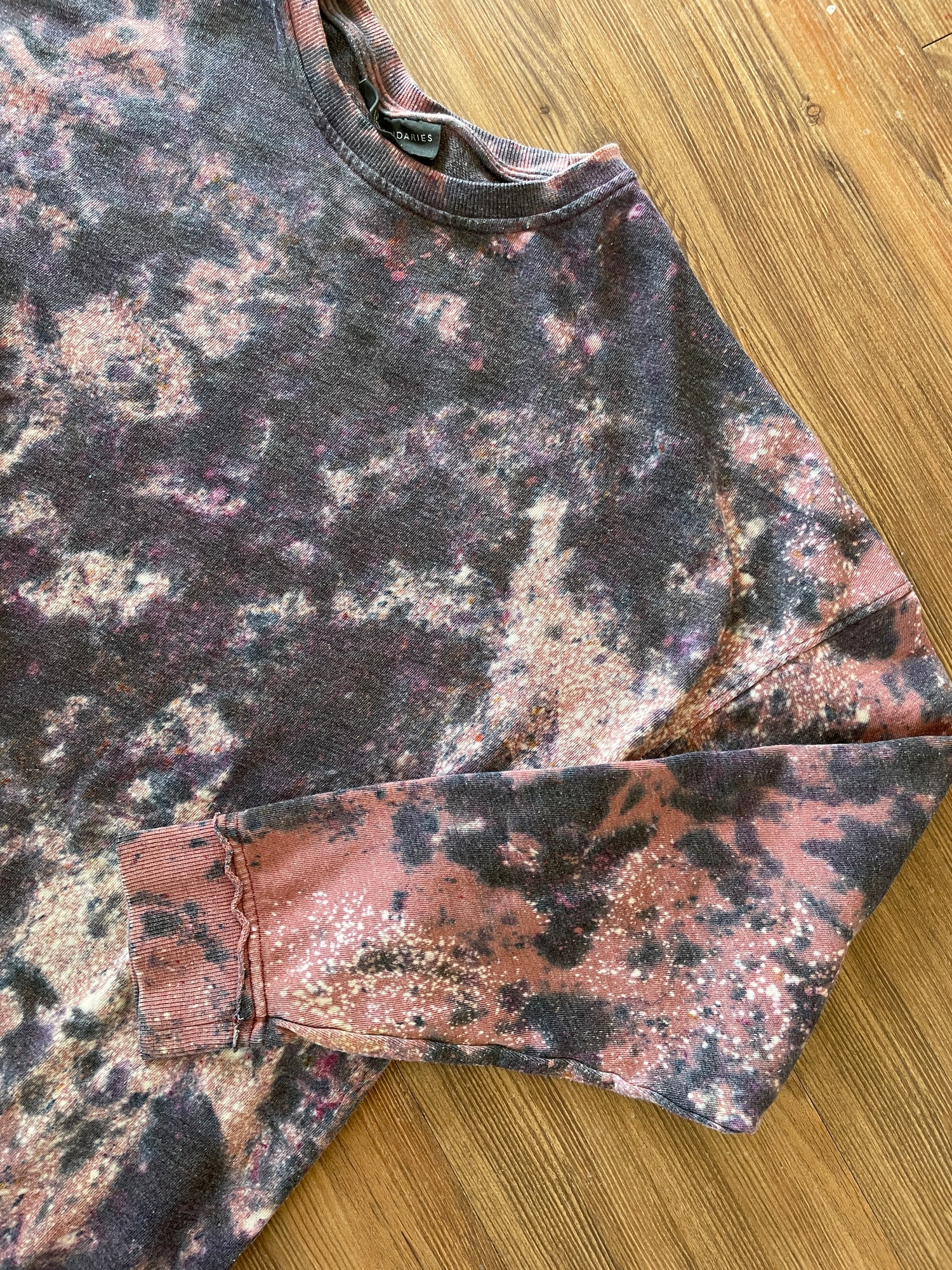light pink sweatshirt dyed with black and bleach crumpled tie dye pattern