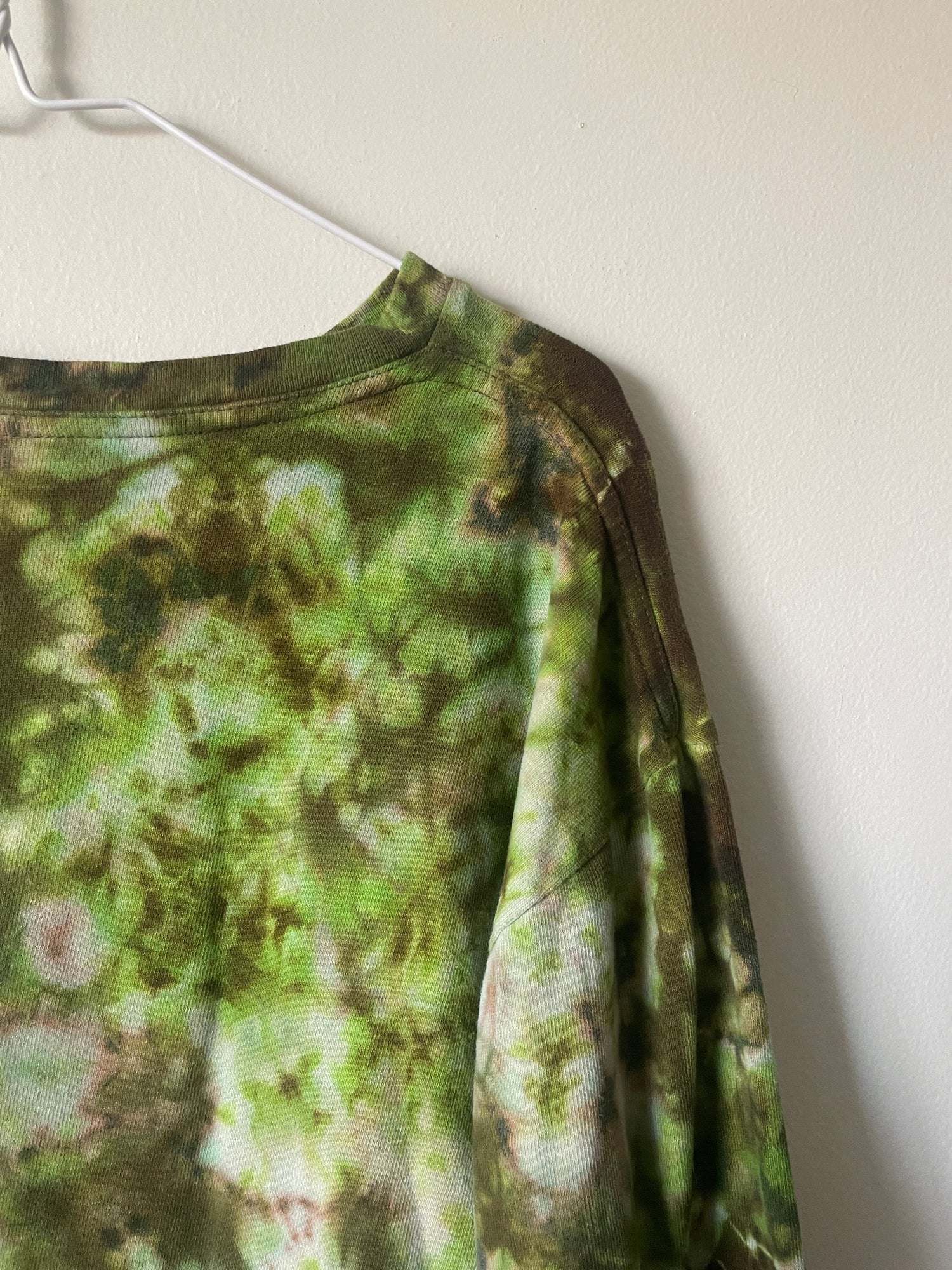 XL Men's Delicate Arch Handmade Reverse Tie Dye T-Shirt | One-Of-a-Kind Upcycled Green and Brown Long Sleeve Shirt