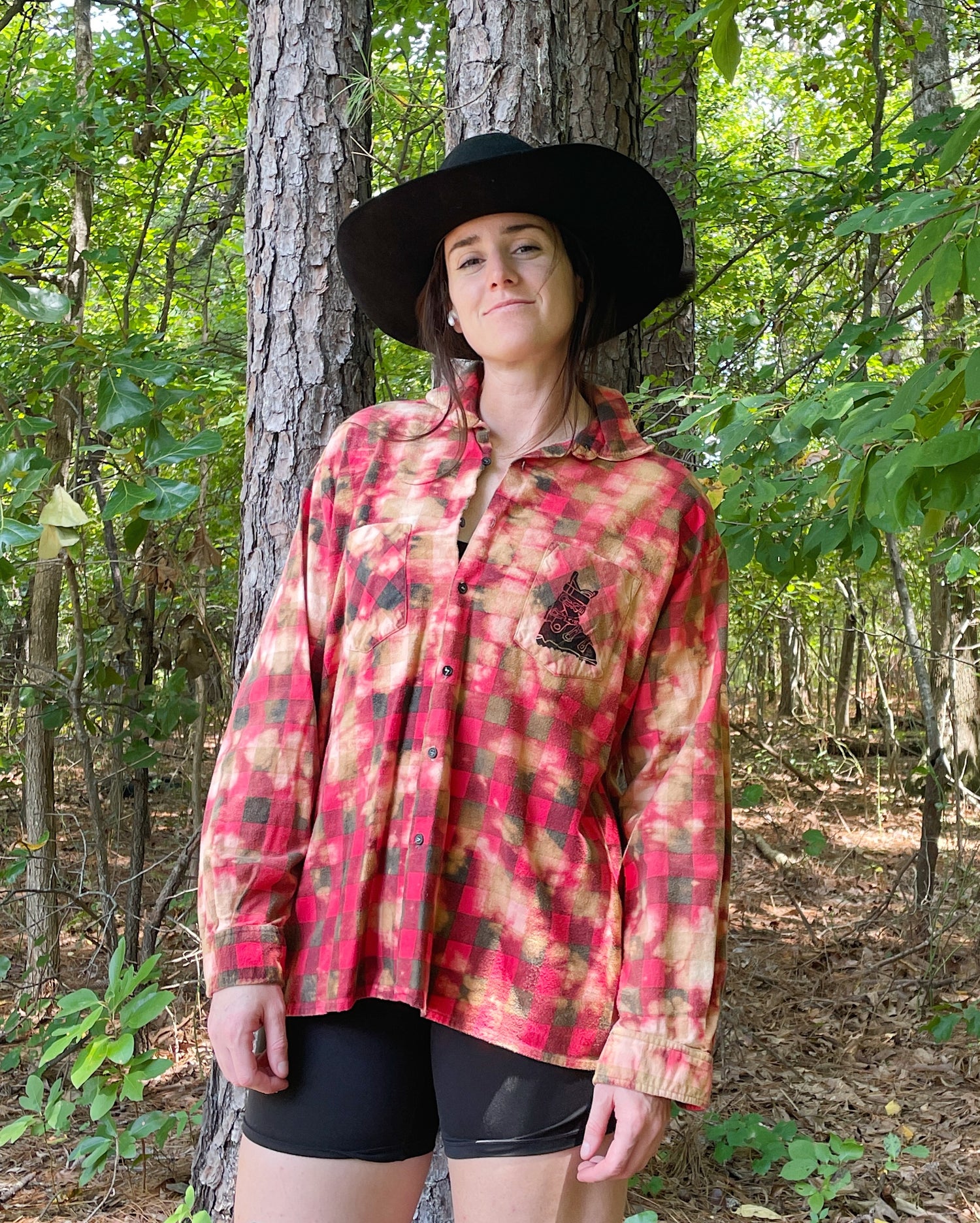 XL Men's Saucatuk Handmade Bleach Dye Buffalo Plaid Flannel Shirt | One-Of-a-Kind Upcycled Long Sleeve with Ski Boot Block Print