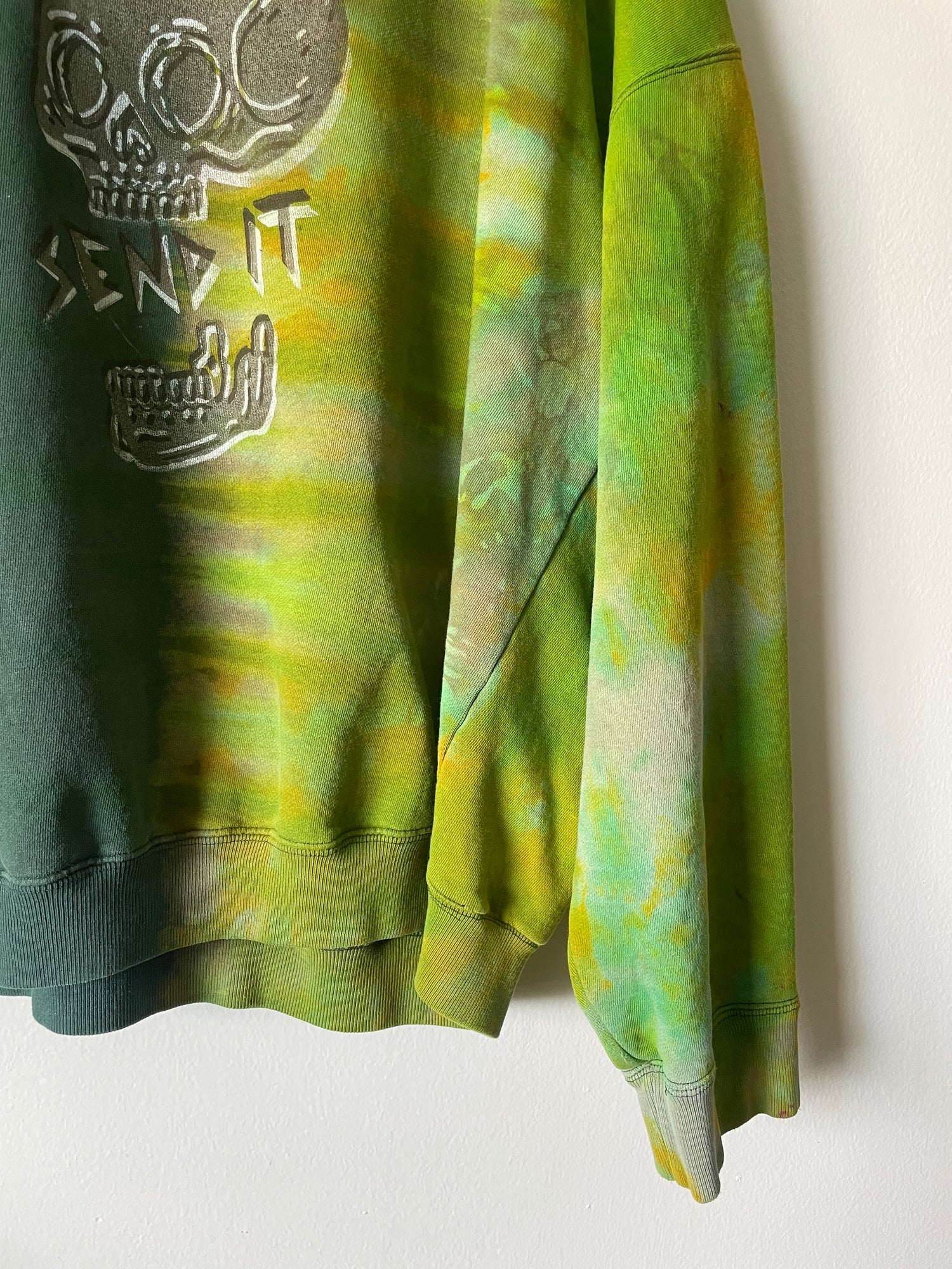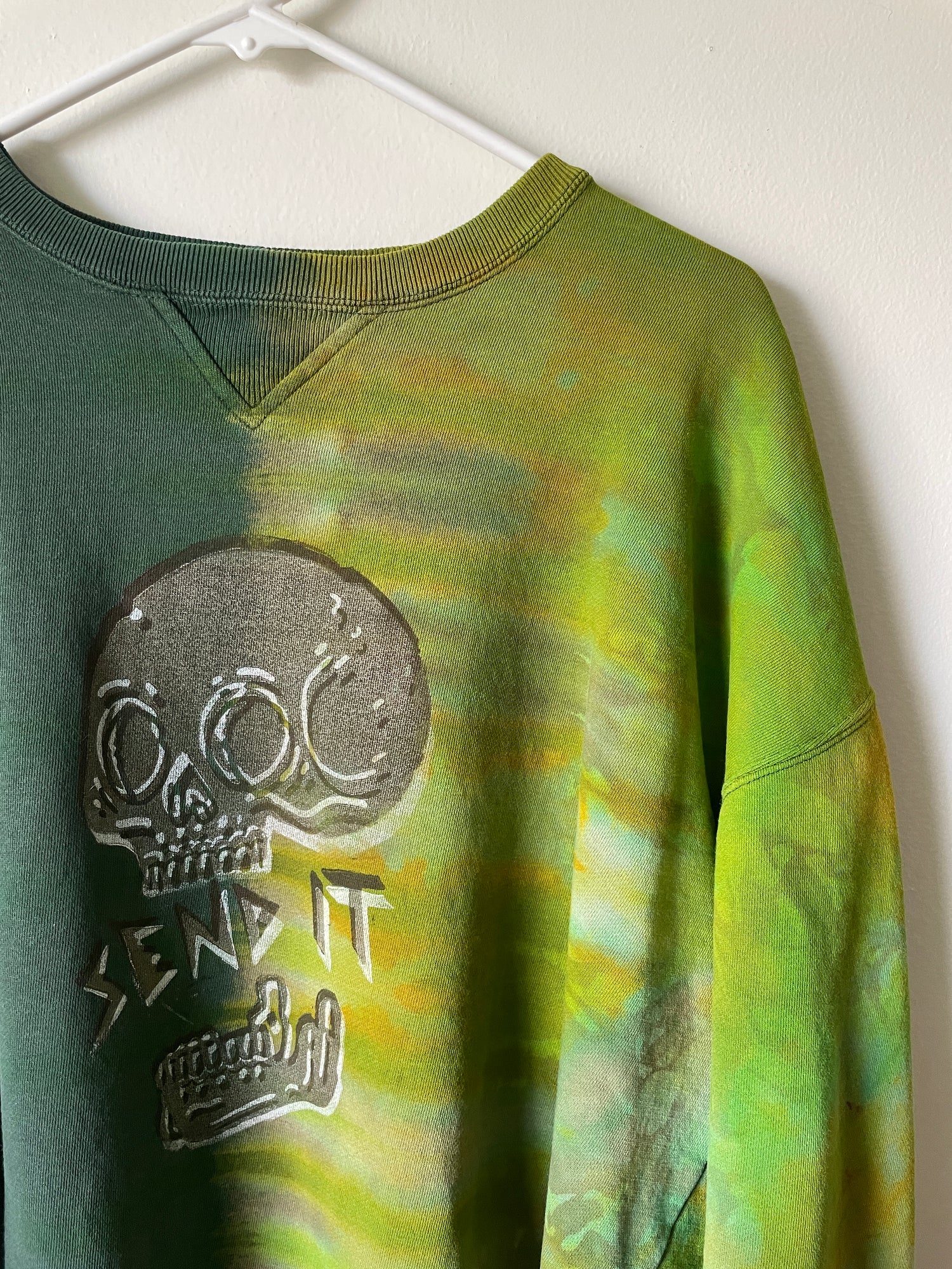 XL Men's Send It Skull Handmade Reverse Tie Dye Crewneck | One-Of-a-Kind Upcycled Green and Gold Long Sleeve Sweatshirt
