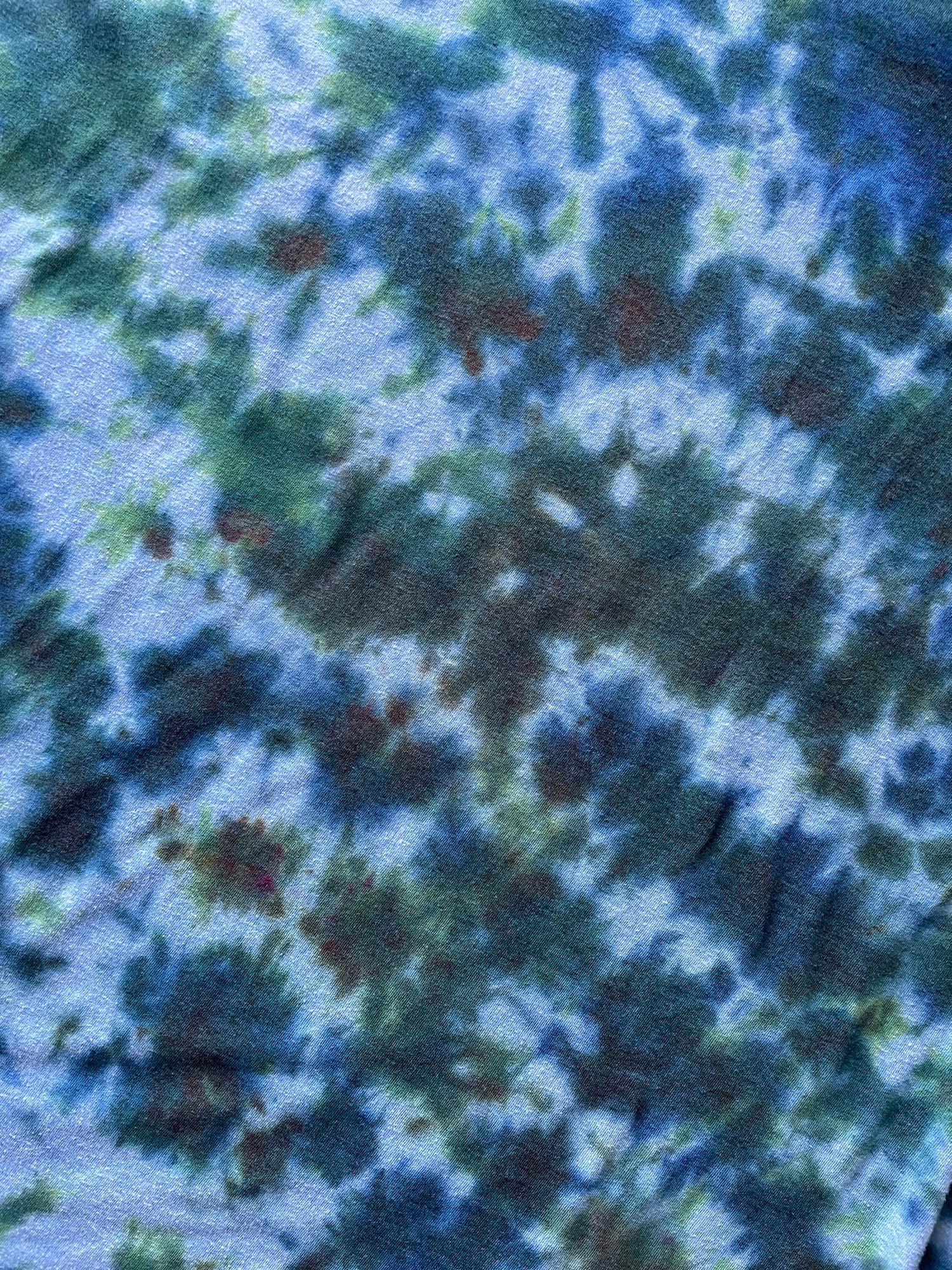 blue tshirt dyed with shades of blue and gray crumpled tie dye pattern