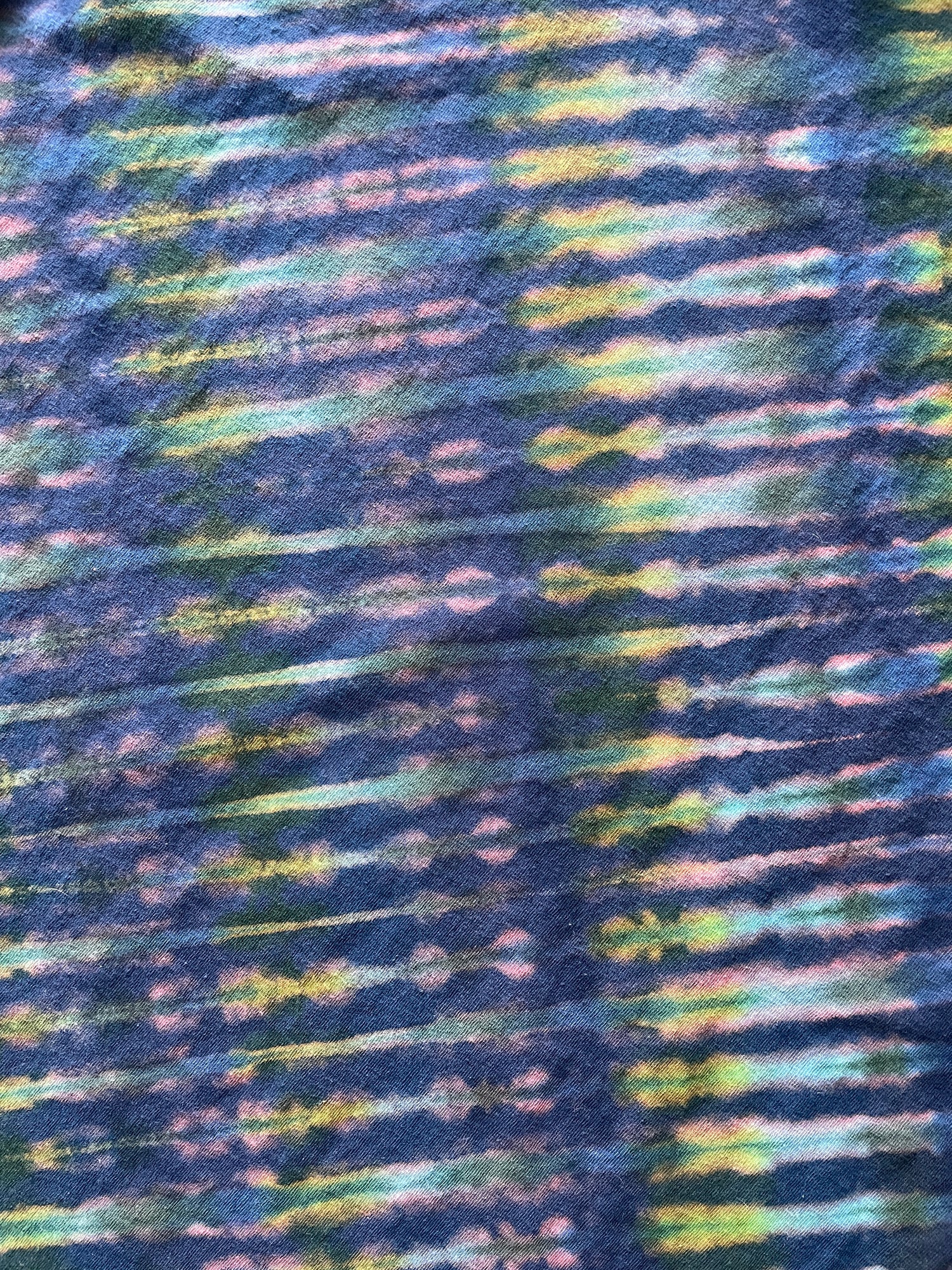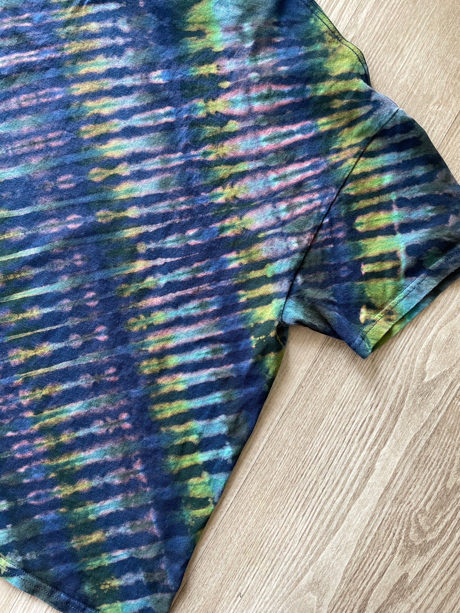 navy blue tshirt bleached and dyed with shades of blue and green pleated tie dye pattern