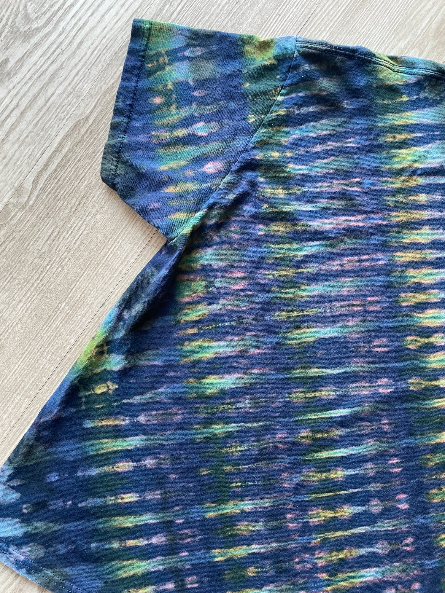 XL Men's Send It Skull Handmade Reverse Tie Dye Short Sleeve T-Shirt | One-Of-a-Kind Upcycled Navy Blue and Green Top