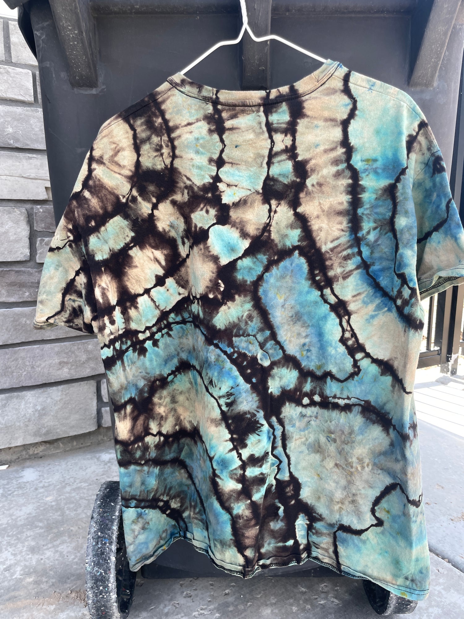 black tshirt bleached and dyed with shades of blue geode tie dye pattern