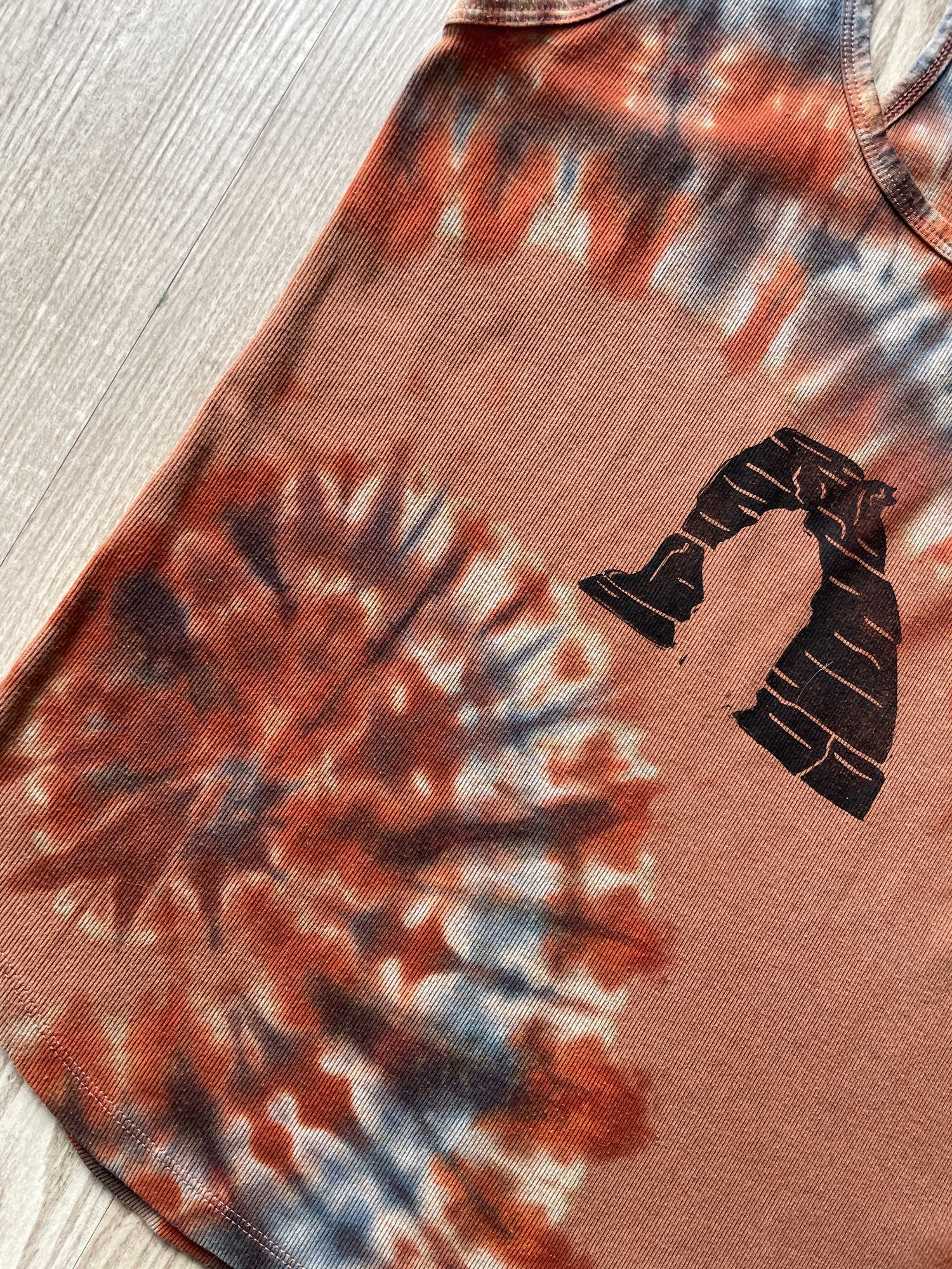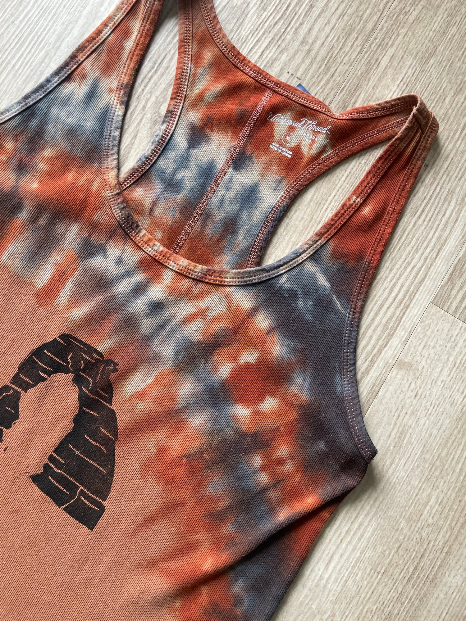 XL Women's Hand-Printed Delicate Arch Reverse Tie Dye Tank Top | Handmade One-Of-a-Kind Upcycled Orange and Black Sleeveless Top