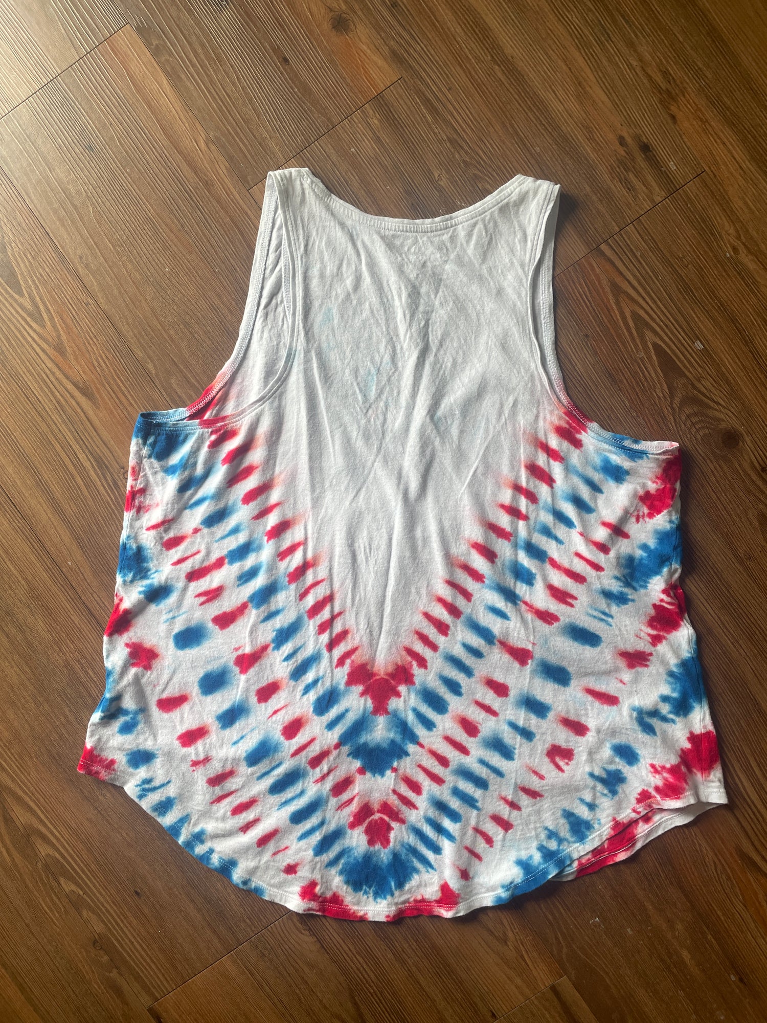 white tank top with red and blue v-pleated tie dye pattern