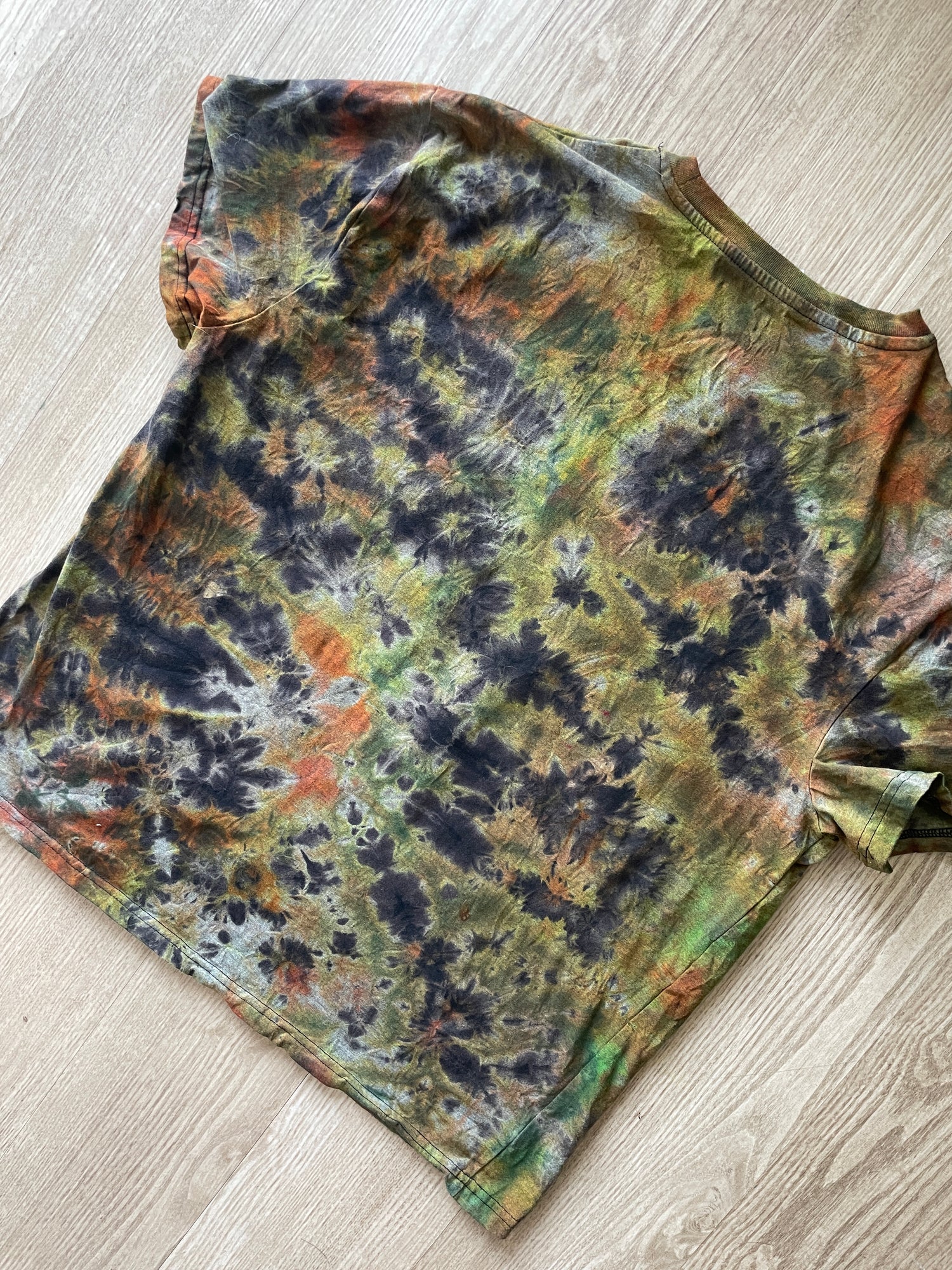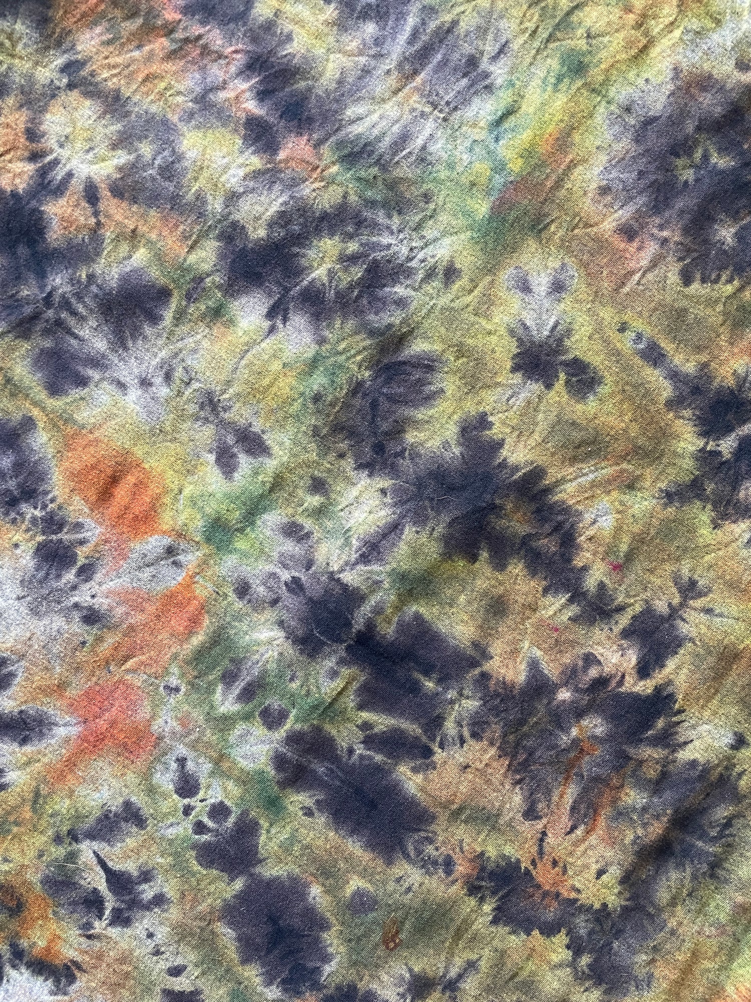 black tshirt bleached and dyed with shades of green and brown tie dye pattern