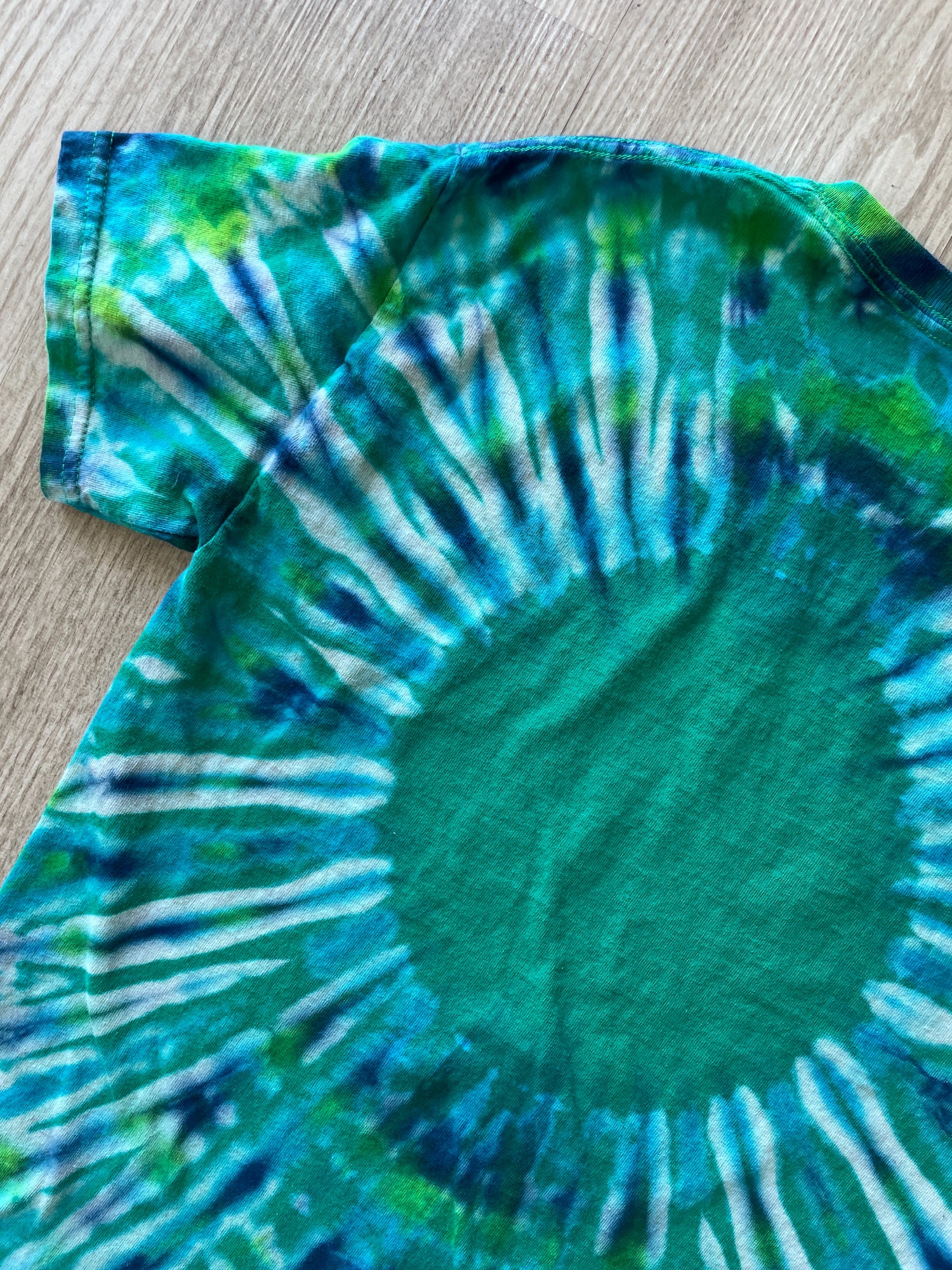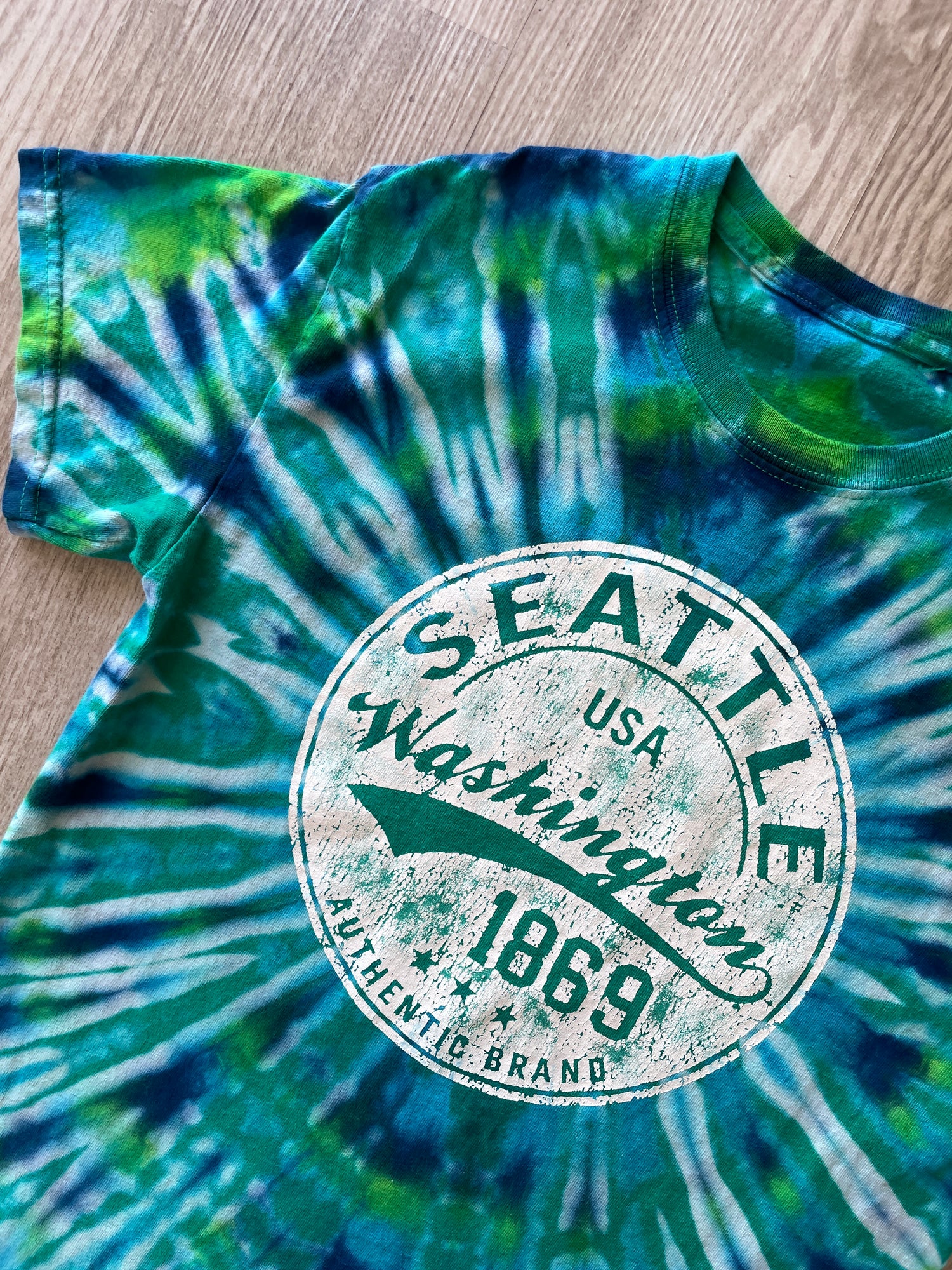 XL Youth Seattle Washington Handmade Tie Dye T-Shirt | One-Of-a-Kind Green and Blue Short Sleeve