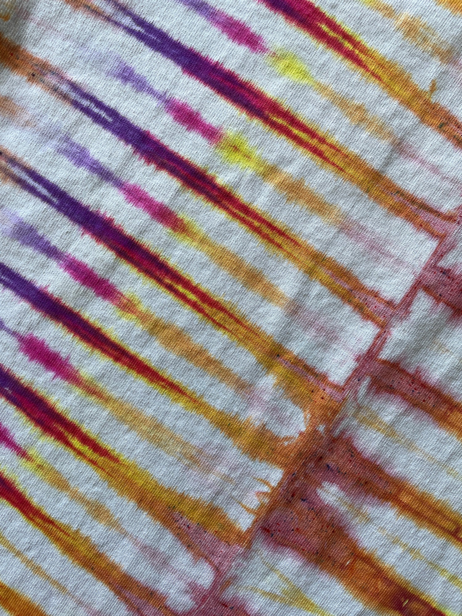 white tshirt dyed with pink, purple, orange, and yellow pleated tie dye pattern
