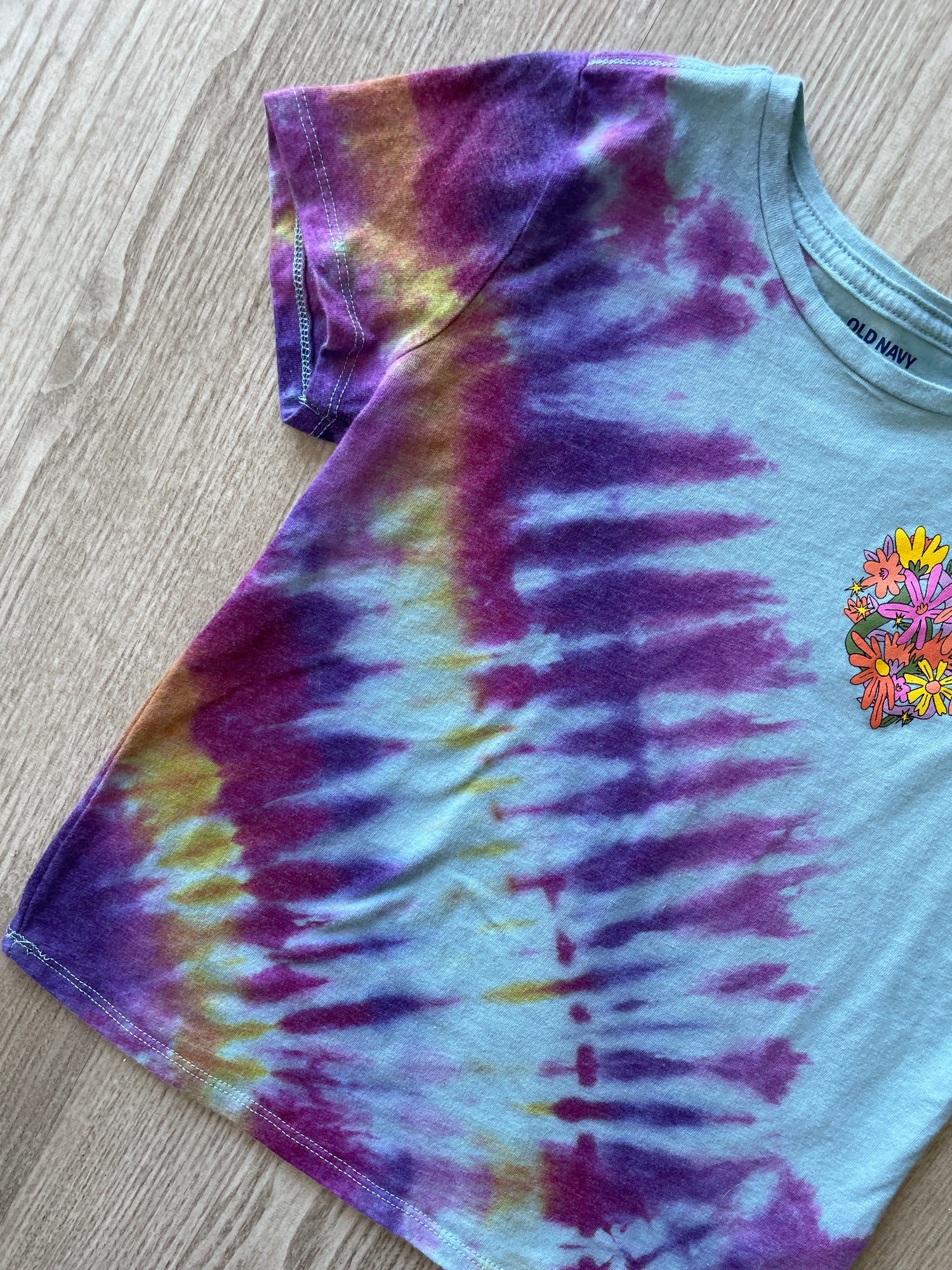 YOUTH GIRLS LARGE Floral Heart Handmade Tie Dye T-Shirt | One-Of-a-Kind Pink and Purple Short Sleeve