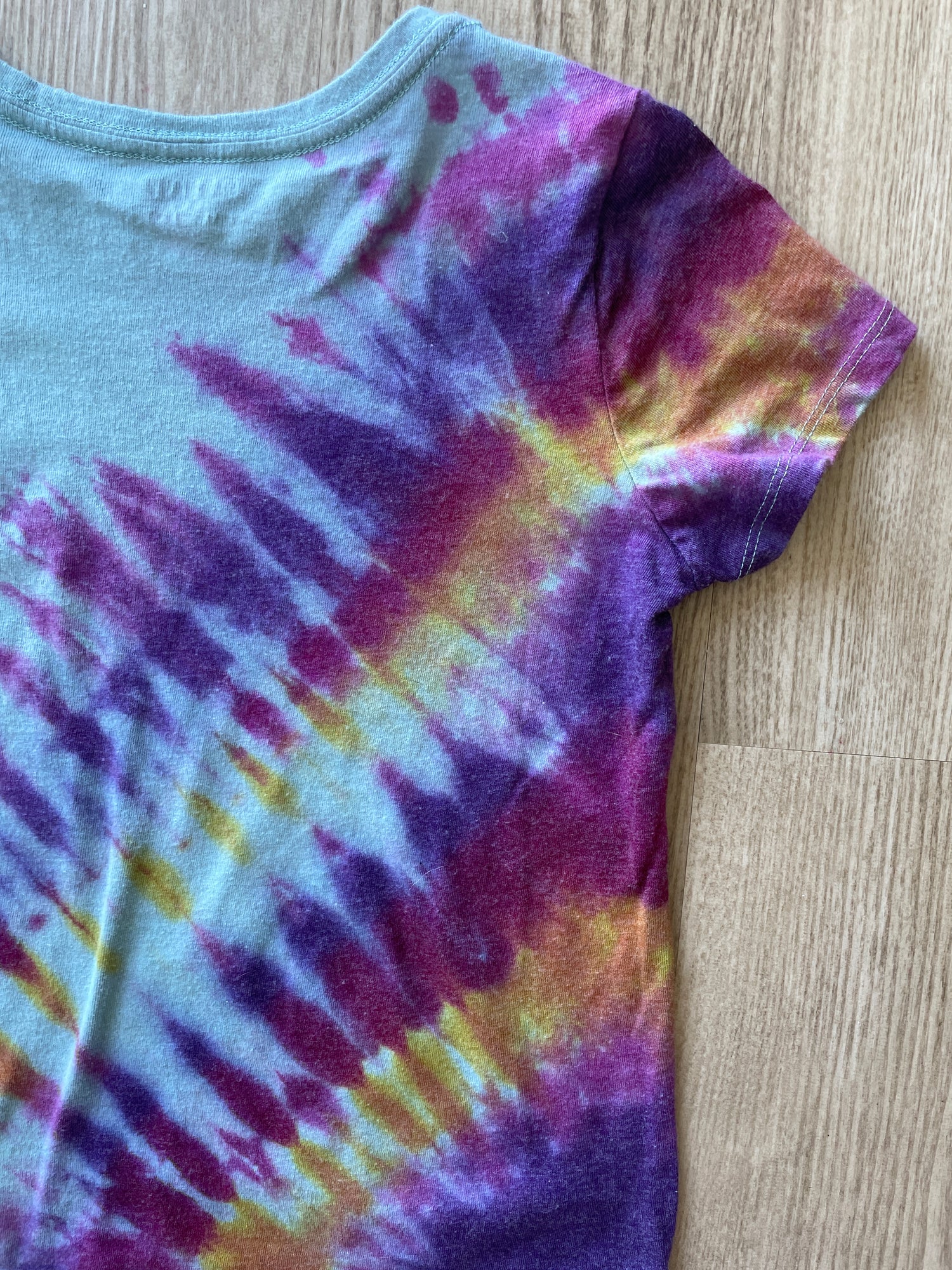 light mint green tshirt dyed with purple, pink, orange, and yellow pleated tie dye pattern