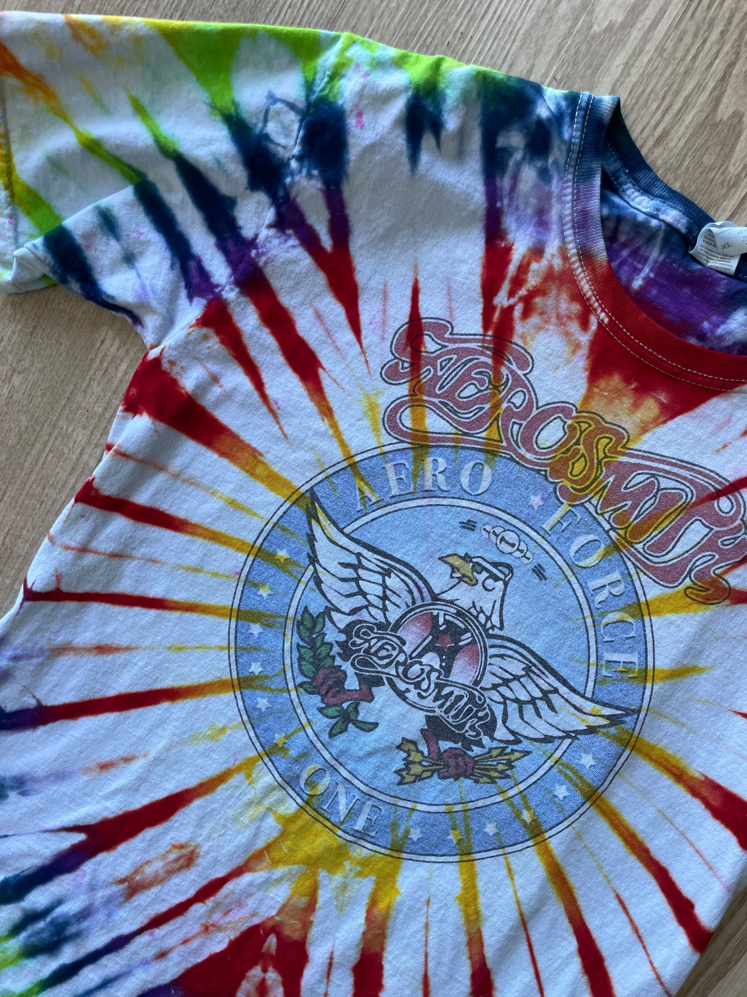 YOUTH XL Aerosmith Aero Force One Handmade Tie Dye T-Shirt | One-Of-a-Kind Rainbow Pleated Short Sleeve